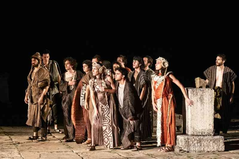 Rigide plissettature, colori caldi, pattern di impatto che progressivamente vengono sostituiti da divise monocrome, a sottolineare l’universalità della vicenda raccontata, ricchi copricapi e corvi antropomorfi. Il mondo che Emanuela Dall’Aglio ha progettato ed eseguito per Edipo, con la collaborazione di Marilena Montini e Ilaria Strozzi, è stato icastico e ha contribuito in maniera significativa ad alimentare la potenza visiva dell’inedita versione della tragedia di Sofocle rappresentata a fine giugno nella cornice del Festival di Teatro Antico di Veleia. A calcare la scena, lo ricordiamo, erano i 20 attori e attrici che hanno preso parte al corso di alta formazione “Bottega XNL – Fare Teatro”, lavorando per settimane sul testo e sulla messa in scena sotto la guida del Maestro di Bottega Marco Baliani.