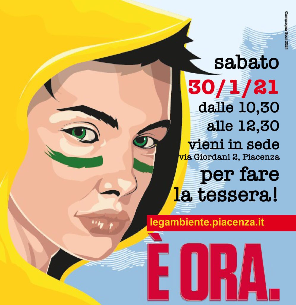 Sabato 30 gennaio 2021 dalle ore 10,30 alle 12,30 la sede di Legambiente Piacenza, Circolo Emilio Politi in via Giordani 2, Piacenza, sarà aperta, con tutte le precauzioni dovute al covid, per accogliere tutti coloro che vorranno fare o rinnovare la tessera per il 2021.