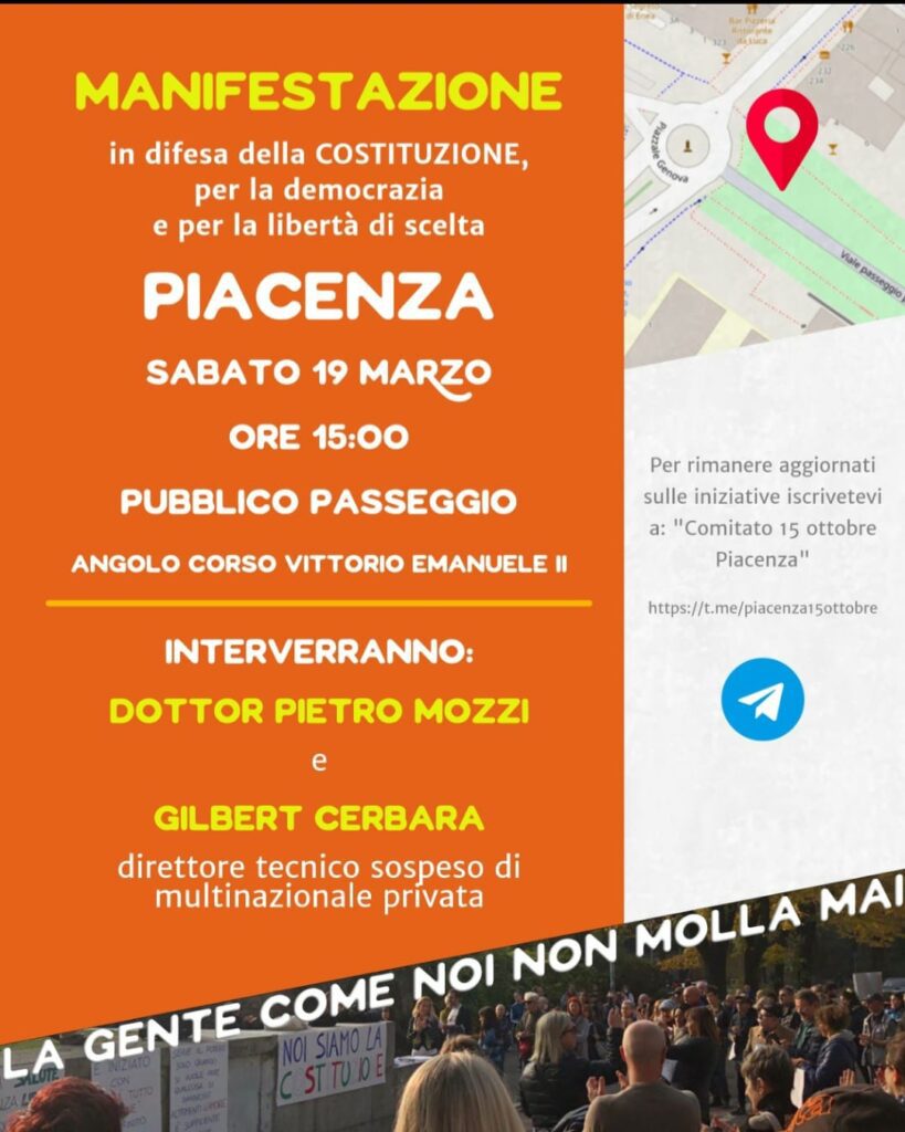 Il comitato 15 ottobre, che si batte per la libera scelta vaccinale e contro il green pass, torna a manifestare sul Pubblico Passeggio. Appuntamento questo pomeriggio alle 15 “in difesa della costituzione, per la democrazia e per la libertà di scelta”, si legge in una nota. Saranno presenti due ospiti speciali: il dottor Pietro Mozzi e Gilbert Cerbara.