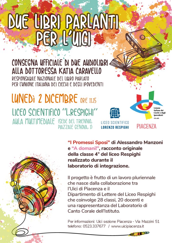 A scuola i libri non si leggono soltanto, ma si possono anche ascoltare. E non solo a scuola, grazie a un progetto che vede coinvolta l’Uici, Unione Italiana dei Ciechi e degli Ipovedenti. A Piacenza, lunedì 2 dicembre, alle 11.15, nell’aula multimediale del Liceo Scientifico “L.Respighi”, nella sede del triennio (piazzale Genova, 1) si terrà l’evento “Due libri parlanti per l’Uici”.