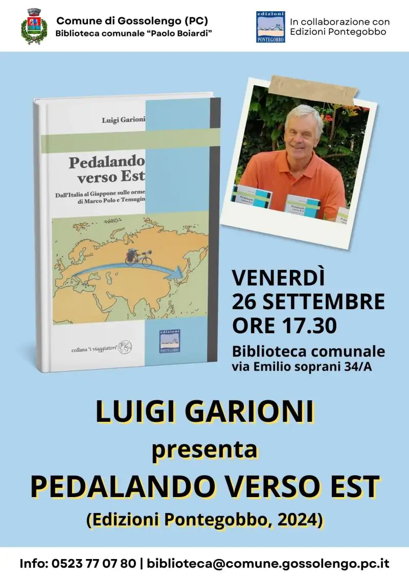 Venerdì 26 settembre 2025 alle ore 17.30, la Biblioteca comunale “Paolo Boiardi” di Gossolengo ospita lo scrittore piacentino Luigi Garioni, ex dirigente scolastico presso l’I.C. di Bobbio, per parlare del suo libro Pedalando verso Est, Dall’Italia al Giappone sulle orme di Marco Polo e Temugin, resoconto del viaggio percorso dall’autore in bicicletta pubblicato da Edizioni Pontegobbo nell’estate del 2024.
