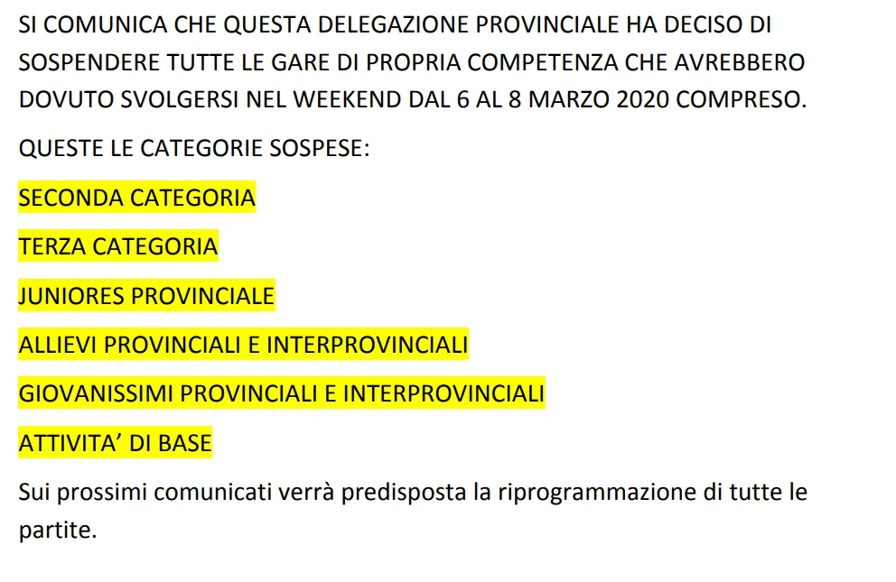 Le gare di prima categoria, eccellenza e promozione che vedono coinvolte squadre piacentine, verranno sospese. Non solo quelle da disputarsi in territorio piacentino ma anche quelle gare, di società piacentine impegnate in trasferta visto che non hanno potuto fare allenamenti nella settimana scorsa. Uscirà un comunicato nella giornata di domani, 3 marzo.