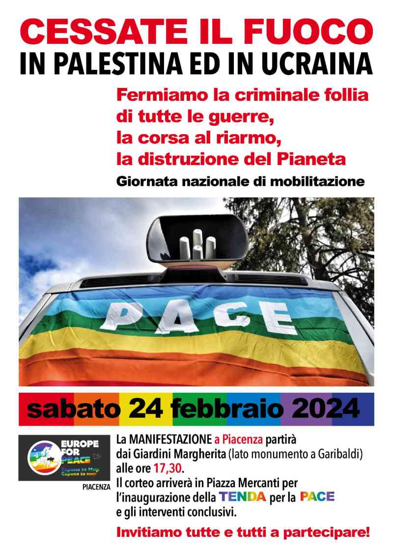 La manifestazione, organizzata dalla sezione piacentina di “Europe for Peace” partirà dai Giardini Margherita alle 17,30. Il corteo arriverà in piazza Mercanti per l’inaugurazione della “Tenda per la Pace”, installazione che resterà in piazza Mercanti per due settimane.