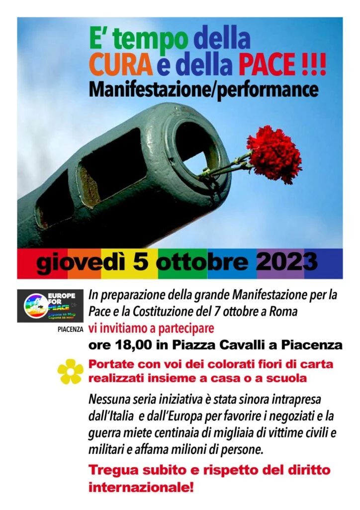 E’ tempo della Cura e della Pace, manifestazione in Piazza Cavalli il 5 ottobre alle ore 18. L’evento si tiene in preparazione della grande manifestazione per la pace e per la costituzione in programma a Roma il 7 ottobre.