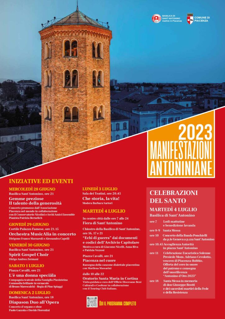 Il 28 giugno alle 21 alla Basilica di Sant’Antonino andrà in scena “Gemme preziose – Il talento della Generosità”, reading che vedrà Luca Isidori come voce narrante accompagnato da una serie di musicisti di grande pregio. Ingresso a offerta libera. Il 30 giugno, sempre all’interno della Basilica si esibirà invece lo Spirit Gospel Choir, sempre alle 21. Lunedì 3 luglio alle 21, alla Sala dei Teatini si terrà invece il convengo “Che storia, la vita! – Dal tempo di Sant’Antonino a oggi, il Vangelo cammina sulle nostre gambe”, con Alberto Carenzi, Blerta Dobroshi, Mira Maria Simi, Enzo Zerbini. Modera Barbara Sartori. Il 4 luglio sarà il giorno della tradizionale fiera che culminerà alle 20,45 in piazza Cavalli con “Piacenza nel cuore 2023”, 28esima edizione della rassegna di canzoni dialettali a cura di Marilena Massarini.