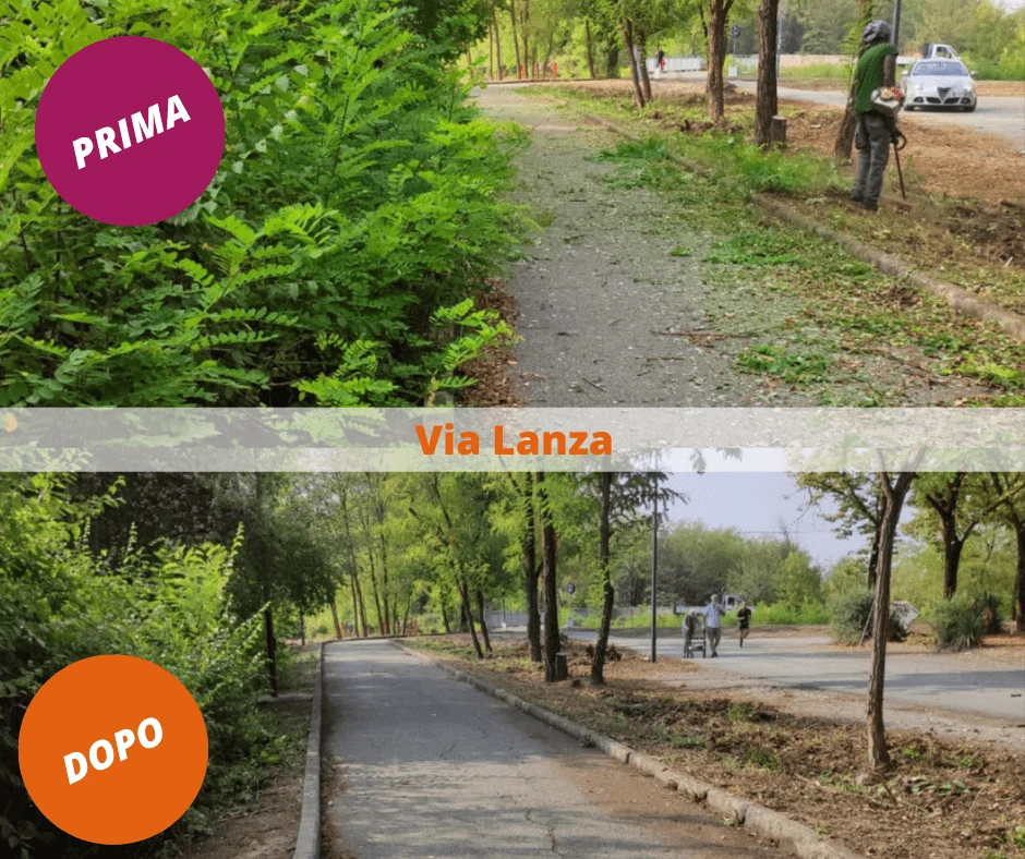 Per la seconda area verde, la riqualificazione ha comportato due diversi interventi: sul lato verso via Vittorio Veneto sono state eliminate tutte le infestanti specialmente di Robinia Pseudoacacia e ripulita l’area verde antistante al fine di rendere maggiormente fruibile la ciclabile di via Tansini. La pulizia dell’area ha comportato un netto miglioramento nella fruizione dell’area. Sul lato di Via Lanza è stata riqualificata la “striscia” di terra che collega la ciclabile con il parco della Galleana. L’area risultava invasa da rovi ed infestanti (Robinia pseudoacacia) cresciute in modo spontaneo.