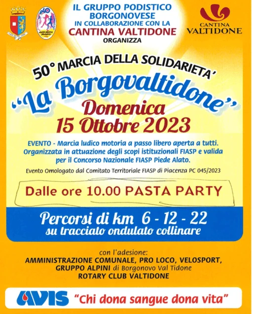 50° Marcia della Solidarietà “ La Borgovaltidone”. Domenica 15 ottobre il Gruppo Podistico Borgonovese, in collaborazione con Cantina Valtidone, organizza la 50° Marcia della Solidarietà “ La Borgovaltidone”.