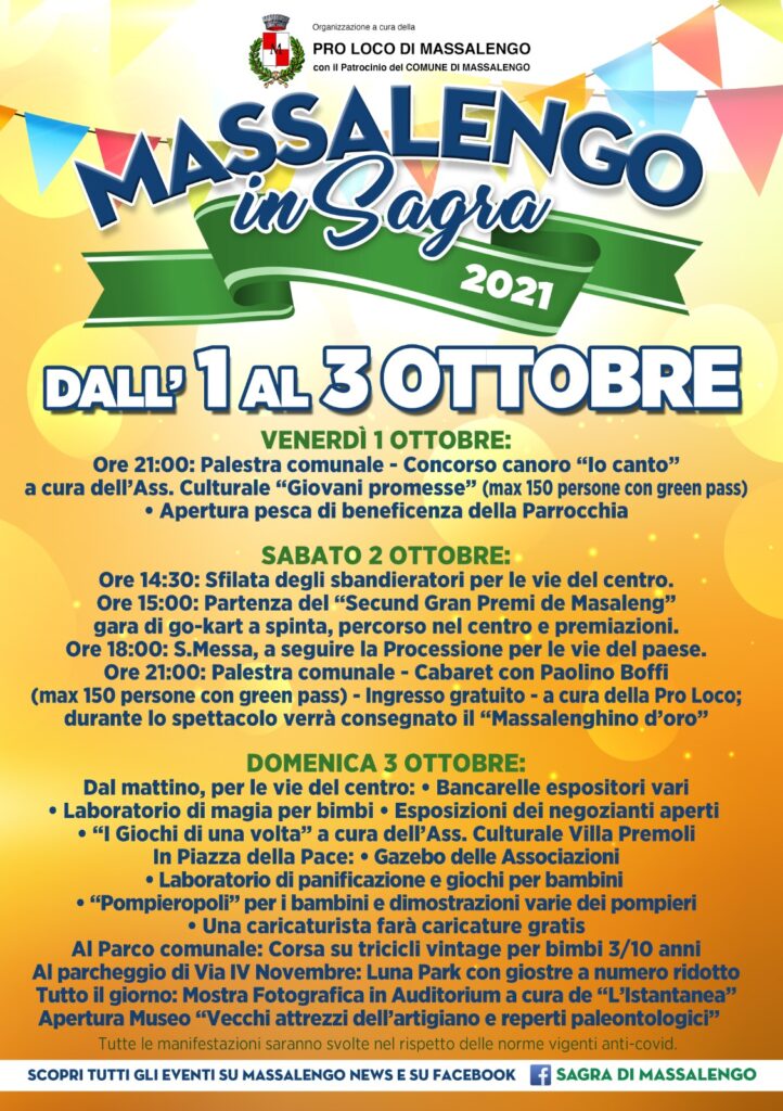 Il programma è molto ricco – spiega il Sindaco di Massalengo Severino Serafini – e dimostra la volontà di tornare a far festa e socializzare. Nei mesi scorsi siamo stati molto rigorosi nel rispetto delle regole anti Covid, quindi adesso anche per ringraziare la popolazione abbiamo deciso di provare, rispettando tutte le norme, a tornare alla normalità”.