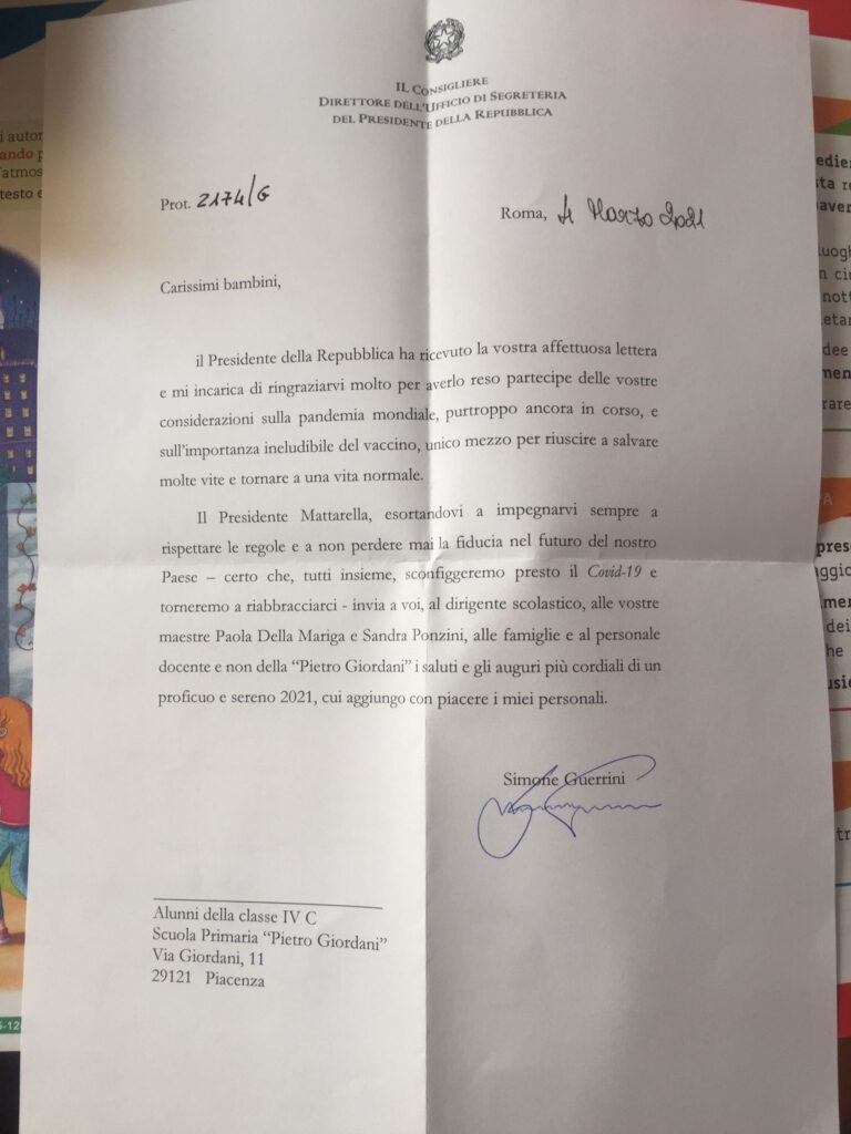 Gli alunni della scuola primaria Giordani hanno scritto una lettera a Mattarella e il Presidente ha risposto. Un’iniziativa che ha coinvolto i giovanissimi guidati dalle insegnanti Paola Della Mariga e Sandra Ponzini.