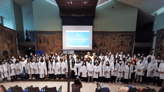 La cerimonia si è aperta con la proiezione di un breve video con interviste a studenti, studentesse e docenti, e si è chiusa con la simbolica consegna di un camice da parte del Rettore Paolo Andrei a una studentessa e a uno studente.