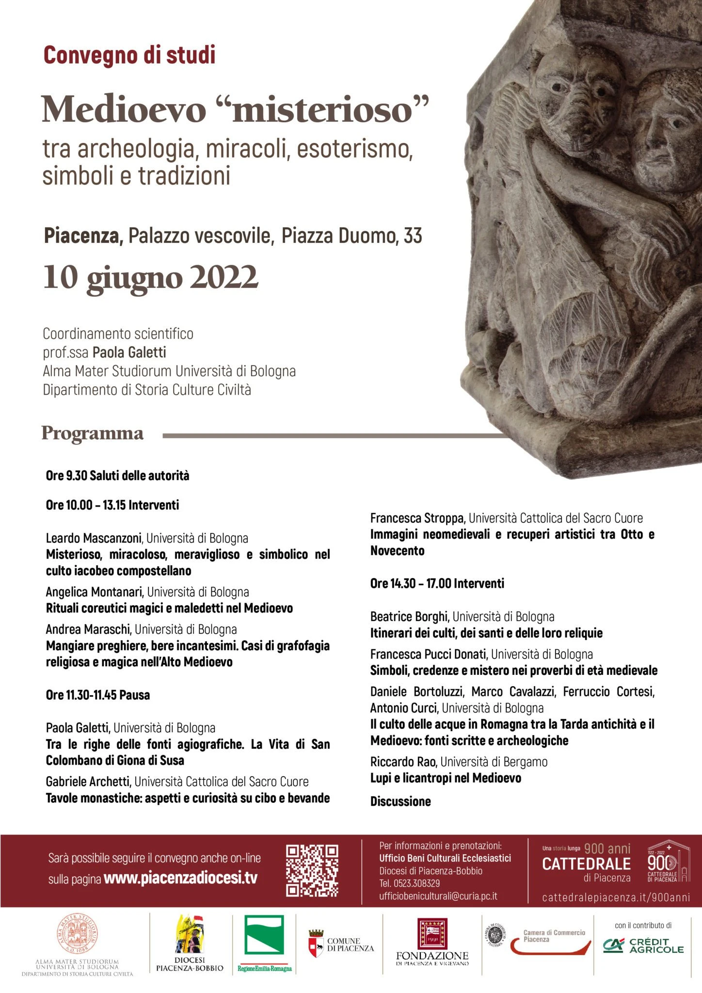Venerdì 10 giugno 2022 a partire dalle ore 9.30 fino alle 18 si terrà presso il Salone degli Affreschi del Palazzo Vescovile il convegno di studi “MEDIOEVO MISTERIOSO – Tra archeologia, miracoli, esoterismo, simboli e tradizioni” con il coordinamento scientifico della prof.ssa Paola Galetti, di Alma Mater Studiorum Università di Bologna, Dipartimento di Storia Culture Civiltà.