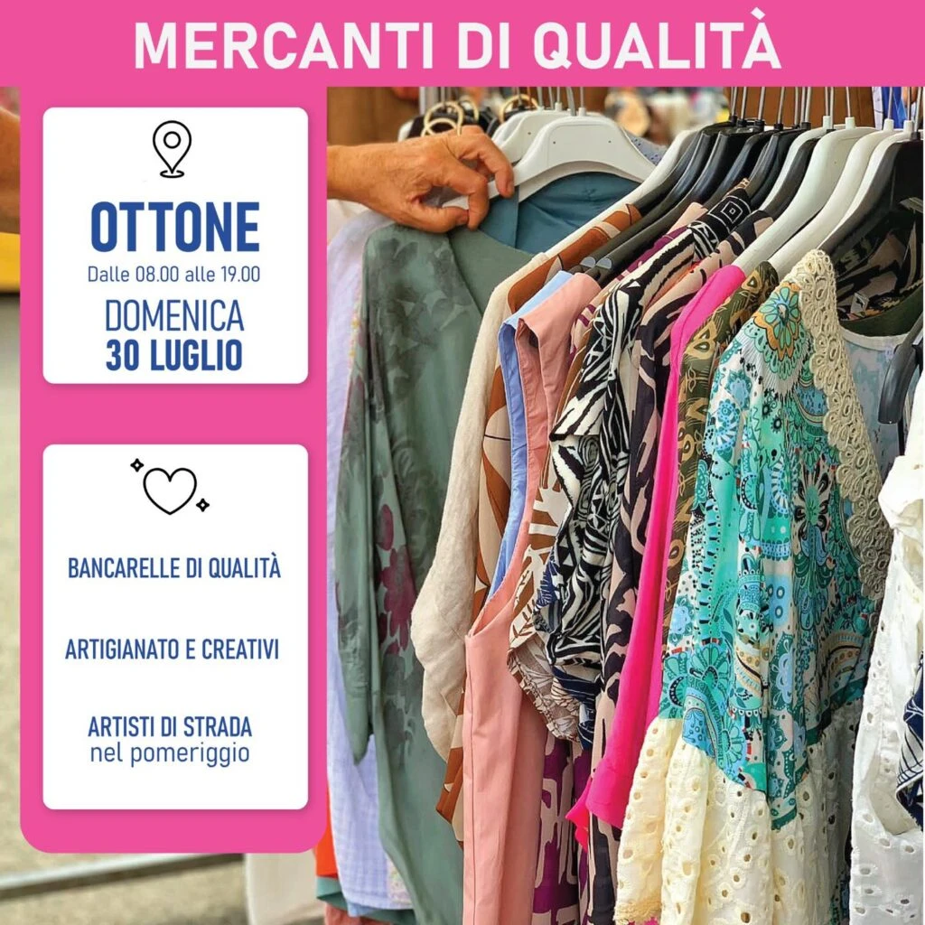 Domenica 30 Luglio è la data che segna il ritorno dei Mercanti di Qualità a Ottone per un evento carico di sorprese e divertimento. Si potrà fare shopping tra le bancarelle dove a trionfare è il Made in Italy, trovando di tutto: abbigliamento, accessori, oggetti unici e molto altro ancora.