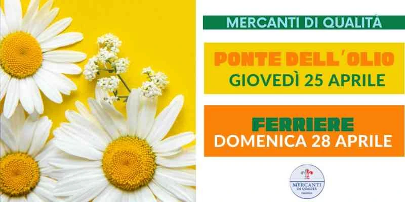 Mercanti di Qualità, pronti per il week end del 25 aprile con un doppio appuntamento Giovedi 25 Aprile in Piazza 1° maggio a Ponte dell’Olio e domenica 28 aprile nel piazzale delle Miniere a Ferriere. Protagonista semprela la qualità dei prodotti rigorosamente “made in Italy”.