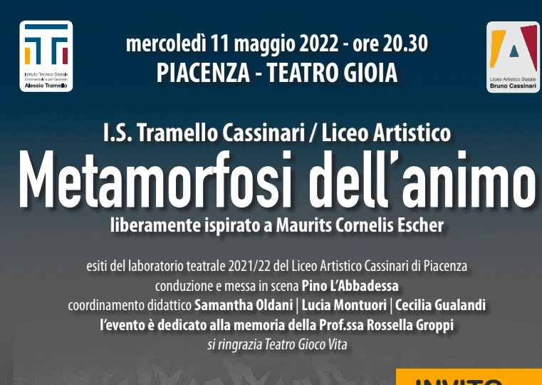 Al Teatro Gioia di Piacenza gli esiti del laboratorio teatrale 2021/2022 del Liceo Artistico Cassinari condotto da Pino L’Abbadessa. Appuntamento mercoledì 11 maggio alle ore 20.30 con “Metamorfosi dell’animo”, liberamente ispirato a Maurits Cornelis Escher, ospitato da Teatro Gioco Vita nel cartellone Pre/Visioni, la sezione della stagione di prosa dedicata in modo particolare agli esiti di laboratori teatrali e proposta con Fondazione Teatri, Associazione Amici del Teatro Gioco Vita e il sostegno della Fondazione di Piacenza e Vigevano.