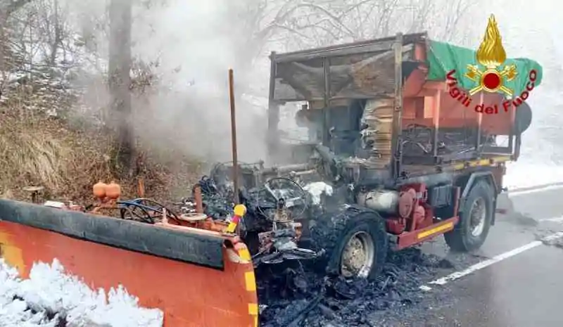 A prendere fuoco un mezzo spargisale. Ancora da chiarire le cause dell’incendio. Fortunatamente il conducente è riuscito ad abbandonare il mezzo prima di riportare ferite.