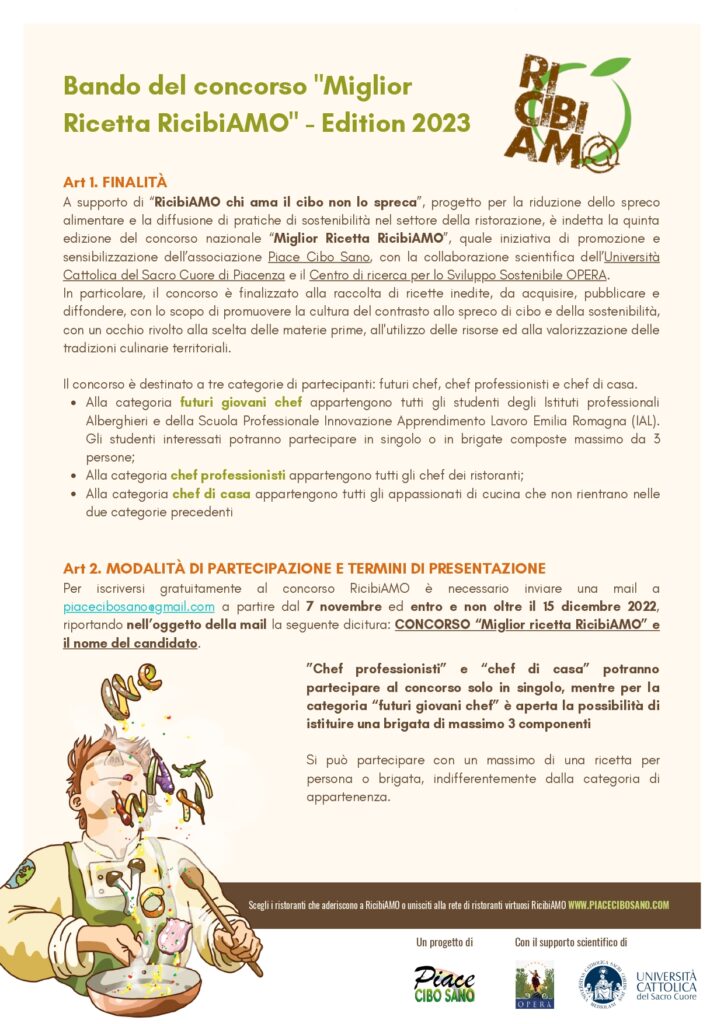 Chef ed appassionati di cucina da tutta Italia sono chiamati a mettere in campo la propria creatività ed il proprio spirito sostenibile dal 7 novembre al 15 dicembre nella nuova edizione del contest “Miglior Ricetta RicibiAMO”. Il concorso, organizzato da Piace Cibo Sano APS in partnership con Università Cattolica del Sacro Cuore e il Centro di Ricerca OPERA, si propone di promuovere la cultura della cucina sostenibile raccogliendo ricette antispreco che prestino attenzione all’utilizzo delle risorse.