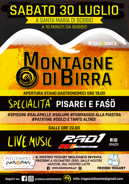 Santa Maria di Bobbio, sabato 30 luglio Montagne di Birra 2022. Durante la serata si potranno gustare pisarei e fasò, spiedini, salamelle, salumi, formaggi alla piastra e dell’ottima birra.