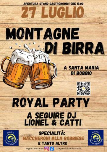 Montagne di Birra 2024 a Santa Maria di Bobbio il 27 luglio. Serata estiva di grande divertimento tra ottime proposte gastronomiche e tanta musica. Infatti l’evento propone la possibilità di degustare maccheroni alla bobbiese, spiedini, salumi, formaggi e birra di qualità.