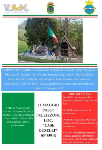 La benedizione sarà preceduta da una piccola processione della Madonna di Fatima che raggiungerà il monumento, da dove presenzierà l’alza Bandiera a Perenne Memoria dei Piloti deceduti. Dopo la funzione religiosa, sarà scoperta una targa a ricordo dell’evento.