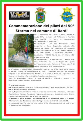 Monumento ai piloti, sabato 11 Maggio 2024 dalle ore 10,45 alle ore 11,00 in Località “Case Guselli” al Passo del Pellizzone – Bardi (PR) si terrà una cerimonia commemorativa a ricordo dei piloti, il sottotenente Roberto Varaldo e sottotenente Aldo Spagnol entrambi deceduti nell’in volo il 13 Maggio 1971.