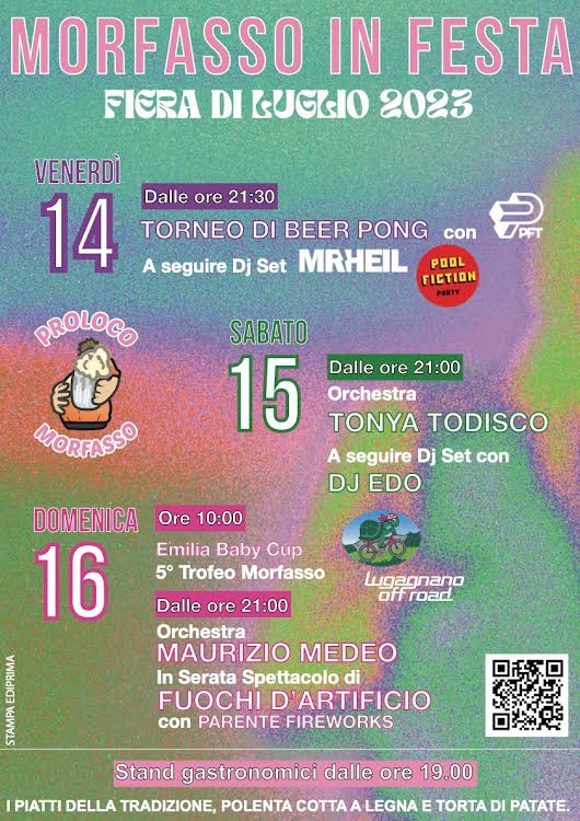 Morfasso in Festa 2023, musica e specialità culinarie dal 14 al 16 luglio. Presenti stand gastronomici con polenta cotta a legna, torta di patate e varie specialità.