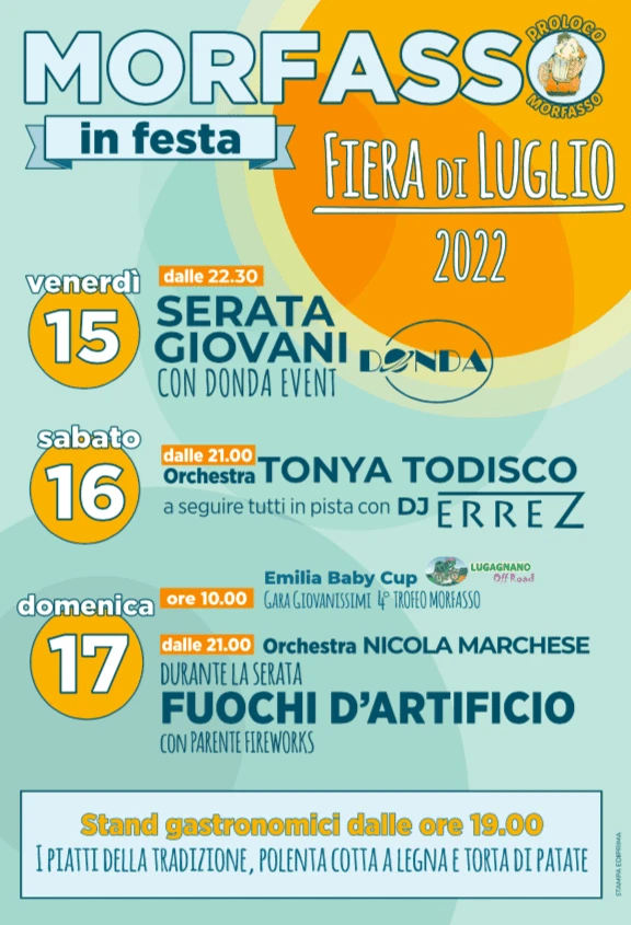 Morfasso in Festa, Fiera di Luglio 2022 dal 15 al 17 luglio. Durante la tre giorni: piatti della tradizione, polenta cotta a legna, torta di patate e divertimento per tutti.