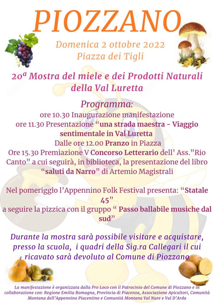 Mostra del Miele e dei prodotti naturali della Val Luretta a Piozzano il 2 ottobre. Una domenica all’insegna dell’energia e della salute in Piazza dei Tigli a Piozzano.