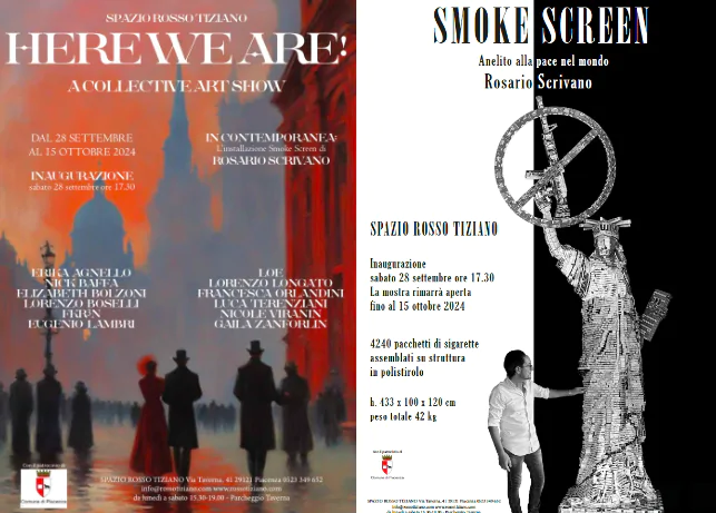 In contemporanea con la mostra HERE WE ARE! sarà presente l’installazione SMOKESCREEN di Rosario Scrivano, un’opera costituita da 4.240 pacchetti di sigarette assemblati su struttura di polistirolo, di altezza pari a 4,33 metri. Riteniamo che le motivazioni, l’originalità, le dimensioni di quest’opera potranno attirare parecchi visitatori, anche da altre province.
