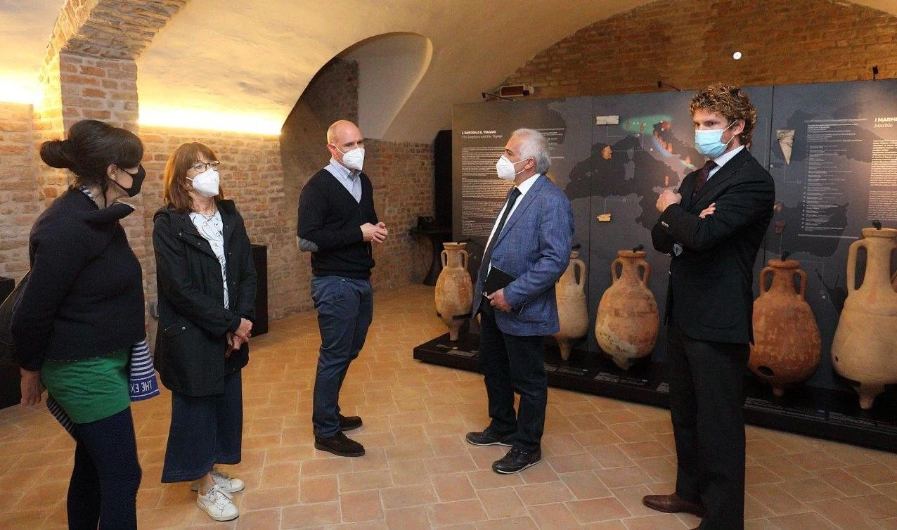 L’architetto Corrado Azzollini, soprintendente all’Archeologia, Belle Arti e Paesaggio per le Province di Parma e Piacenza, è stato stamani in visita alle sale della nuova Sezione Archeologica di Palazzo Farnese, accompagnato dall’assessore alla Cultura Jonathan Papamarenghi, dal direttore dei Musei Antonella Gigli, da Marco Podini, funzionario della Soprintendenza (Area patrimonio archeologico) e Micaela Bertuzzi, archeologa, appartenente all’associazione culturale Arti e Pensieri. Di fatto, i componenti del Comitato scientifico che ha curato il nuovo allestimento della Sezione Romana nella suggestiva collocazione in una parte dei sotterranei.