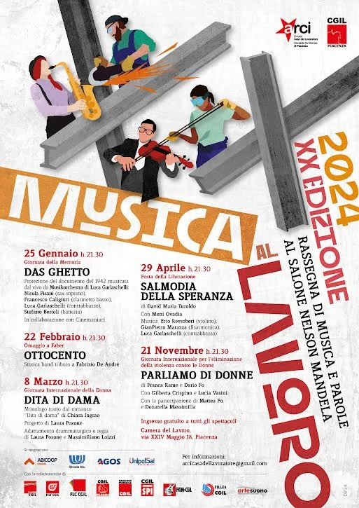 “Cgil e Arci Piacenza caparbiamente arrivano ai 20 anni di Musica al Lavoro – commenta il direttore artistico, Garlaschelli – è fondamentale tenere viva la memoria su celebrazioni di momenti fondativi del nostro essere comunità: Shoa, l’otto marzo, la Resistenza, la lotta alla violenza sulle donne. Perché essere comunità significa condividere valori culturali e identitari formati dall’elaborazione di momenti cruciali della nostra Storia. Ricordare e riflettere”.