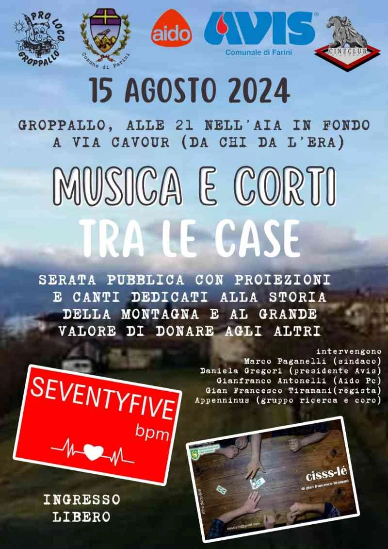 Musica e corti tra le case, il 15 agosto a Groppallo. Originale appuntamento alle ore 21.00 del prossimo ferragosto per l’evento organizzato dalla locale Pro Loco, in collaborazione con il Comune e la sezione AVIS di Farini e con il Cineclub Piacenza G. Cattivelli.