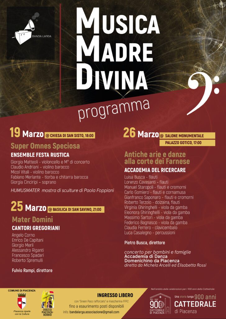 “Il festival “Musica Madre Divina” – ha sottolineato l’assessore alla Cultura, Jonathan Papamarenghi – pone al centro della rassegna tre concerti di ampio respiro artistico, ospitati in alcuni luoghi simbolo e tra i più rappresentativi della nostra città da un punto di vista storico e culturale. Organizzato dall’associazione culturale “Banda larga” in collaborazione con il Comune di Piacenza – nell’ambito delle iniziative sostenute dal bando “Piacenza riparte con la cultura” – e con la Diocesi di Piacenza-Bobbio, all’interno delle celebrazioni per i 900 anni della Cattedrale, il festival testimonia l’importanza che la musica e la cultura rivestono per la nostra comunità in un momento particolarmente difficile come quello attuale. Abbiamo più che mai bisogno di uscire da uno stato di avvilimento, frutto della pandemia prima e delle tragiche notizie che arrivano dall’Ucraina oggi, che colpisce soprattutto i più giovani. E proprio grazie alla musica e agli artisti che si esibiranno in occasione del festival sarà possibile – io credo – guardare al futuro con maggiore fiducia e speranza”.