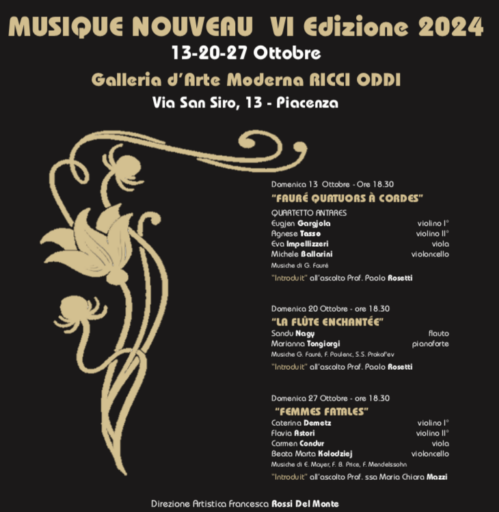 Nella terza e successivamente nella quarta Edizione, si è proseguito con la mission di valorizzare le eccellenze artistiche del nostro territorio. Nell’ Edizione 2021 si è aperta la possibilità di iniziare un circuito virtuoso che metta in relazione i molteplici aspetti della declinazione Liberty della città di Piacenza. La Rassegna MUSIQUE NOUVEAU è proposta come sesto anno a seguito delle edizioni precedenti che hanno raccolto unanimi consensi di pubblico e critica, con un calendario di tre appuntamenti domenicali nel mese di Ottobre.