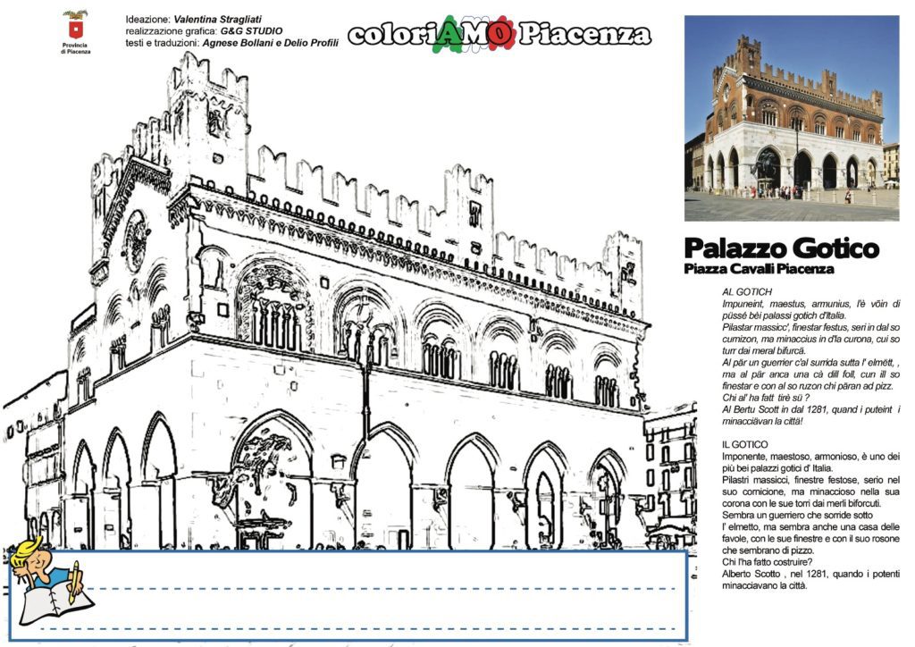 L’amministrazione invita così i bambini a colorare luoghi storici, piazze e monumenti della città e della provincia di Piacenza. Sono state realizzate, infatti, n. 10 schede da colorare che potranno essere scaricate dal sito www.provincia.pc.it a titolo gratuito e che riportano, a fianco, l’immagine reale del monumento e una piccola didascalia in italiano e in dialetto. Al di sotto di ogni immagine ciascun bambino potrà dedicare un pensiero a Piacenza.