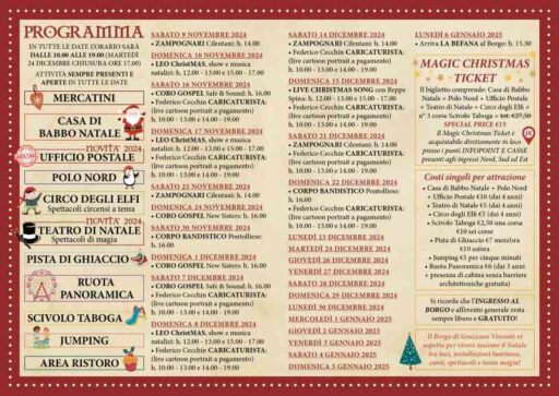 Come sempre – spiega Martina Dal Molin di Tipico Eventi – tutto il borgo verrà allestito a festa con i suggestivi mercatini, alimentari e artigianali, e poi tutta un’area allestita a Villaggio di Babbo Natale. Anche quest’anno è stato riconfermato il Circo degli Elfi, che nel 2023 era piaciuto molto ai bimbi che sono venuti a trovarci. Tra le novità, un grande spazio all’ufficio postale per imbucare la propria letterina.