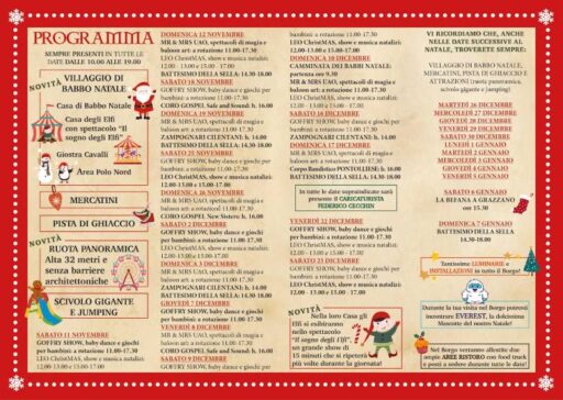 Faremo 28 date con diverse novità. Ad esempio la casa di Babbo Natale si fa ancora più grande. Abbiamo introdotto la casa degli Elfi e la giostra cavalli. Gli Elfi sono dei veri e proprio acrobati che faranno uno spettacolo bellissimo di 15 minuti che si ripete per tutta la giornata. L’altra novità riguarda la ruota panoramica che sarà ancora più grande e si potrà vedere tutto il Borgo della alto. Tra l’altro sarà senza barriere architettoniche.