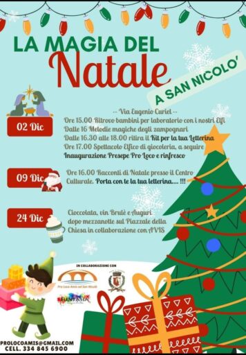 Sabato 2 dicembre in Via Curiel a San Nicolò “La magia del Natale” dalle ore 15.00 laboratori per bambini, zampognari, letterina a Babbo Natale, spettacolo con gli Elfi, inagurazione presepe Pro Loco Amis ad San Niculò e rinfresco. Per info prolocoamis@gmail.com – telefono 334 8456900