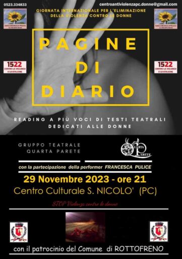 Natale a Rottofreno con tante iniziative a cominciare da Mercoledì 29 novembre al Centro Culturale di San Nicolò alle ore 20.15 lo spettacolo “Pagine di Diario” con il gruppo teatrale Quarta Parete. Lettura di brani tratti da testi di vari autori accompagnata da un collage di performances di teatro e danza. In occasione della Giornata Internazionale per l’eliminazione della violenza contro le donne. Accesso gratuito.