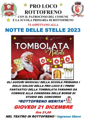 Giovedì 21 dicembre presso il teatro parrocchiale di Rottofreno alle ore 21.00 “Notte delle Stelle 2023” con la Pro Loco Rottofreno e gli auguri musicali degli alunni della Scuola primaria. Durante la serata consegna dei premi “Rottofreno Merita” agli studenti meritevoli. Inoltre giochi, tombolata e brindisi per tutti.