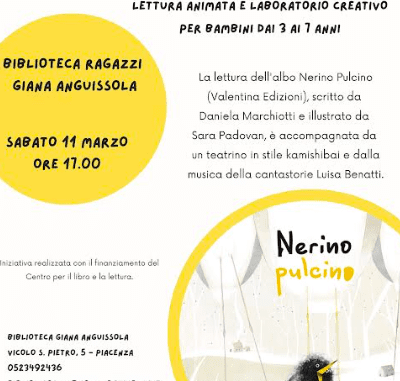 Sabato 11 marzo, alle 17, la Biblioteca Ragazzi Giana Anguissola ospiterà la lettura animata dell’albo “Nerino Pulcino” (Valentina Edizioni), scritto da Daniela Marchiotti e illustrato da Sara Padovan. La lettura sarà accompagnata da un teatrino in stile kamishibai e dalla musica della cantastorie Luisa Benatti.
