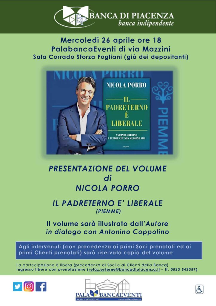 Nicola Porro a Piacenza presenta il suo libro “Il padreterno è liberale”. Appuntamento con l’autore mercoledì 26 aprile alle ore 18 al PalabancaEventi di via Mazzini, alla Sala Corrado Sforza Fogliani.