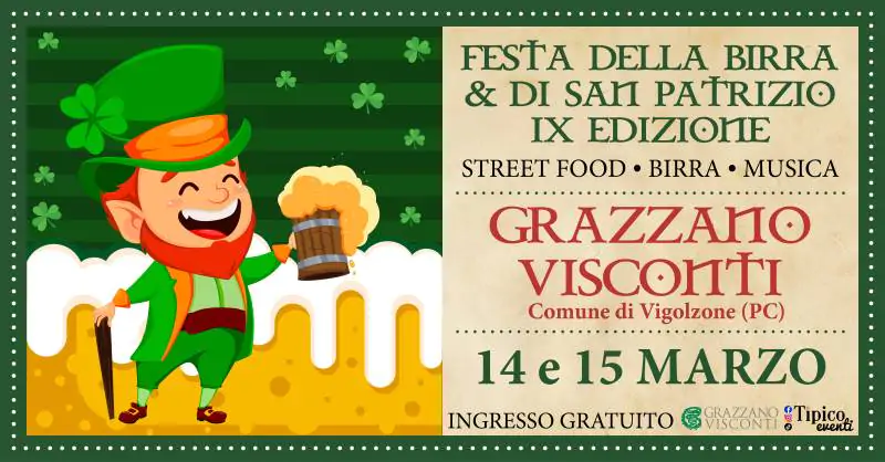Il 14 e 15 marzo Tipico Eventi torna nell’iconico borgo di Grazzano Visconti con la nona edizione della Festa della Birra e di San Patrizio! L’evento più verde dell’anno vi aspetta per un weekend all’insegna della migliore birra, di ottimo street food e di tanto divertimento per tutti, in una cornice suggestiva e folkloristica! La manifestazione aprirà sabato dalle 11.00 alle 23.30 e domenica dalle 11.00 alle 22.30