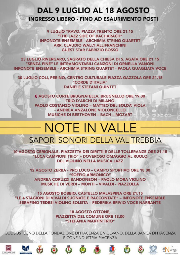 Nel 2020 in collaborazione con i Comuni di Coli, Travo, Rivergaro, Bobbio e Marsaglia ha deciso di dare vita ad un nuovo Festival d’area, “Note in Valle – sapori sonori della Val Trebbia”, che possa unire la presentazione di eccellenze musicali alle risorse dei territori, con l’intento di rivalutare anche quei luoghi poco conosciuti e creare una rete di collaborazione reale e attiva tra i Comuni, presentando un’offerta culturale che possa soddisfare i residenti e i villeggianti e diventare motivo di interesse anche per chi non ha mai frequentato la Val Trebbia.