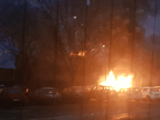Fiamme nel parcheggio della stazione, auto distrutta dalle fiamme e vigili del fuoco al lavoro