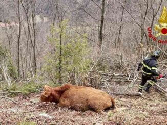 Mucca cade in un dirupo e resta intrappolata, salvata con l’elicottero dai vigili del fuoco – VIDEO