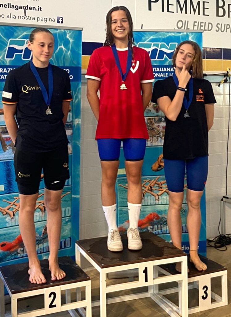 Primo gradino del podio, e titolo regionale, per Ludovica Bonini che nei 50 rana Junior ha firmato una gara perfetta, ulteriormente impreziosita dal crono di 33”,14 che la colloca nella top ten stagionale italiana di categoria. Ludovica ha messo a frutto le sue doti da autentica velocità anche nella mezza distanza, conquistando la medaglia di bronzo nei 100 rana firmando il suo record personale con il tempo di 1’13”,41. Non paga dei risultati raggiunti, Ludovica Bonini ha successivamente migliorato di ben quattro secondi il suo record personale nei 200 rana, fermando il cronometro su 2’52”,63.