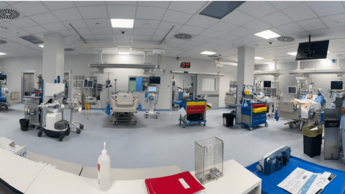 – L’ampia sala rianimazione ospita sette posti letto, tutti dotati di un nuovo sistema di monitoraggio multiparametrico. Ogni posto letto è provvisto di travi e pensili, di sistemi di sollevamento e movimentazione a binario della persona e della strumentazione necessaria alla rilevazione al monitoraggio dei parametri vitali ed emodinamici e la raccolta dei parametri di ventilazione del malato.