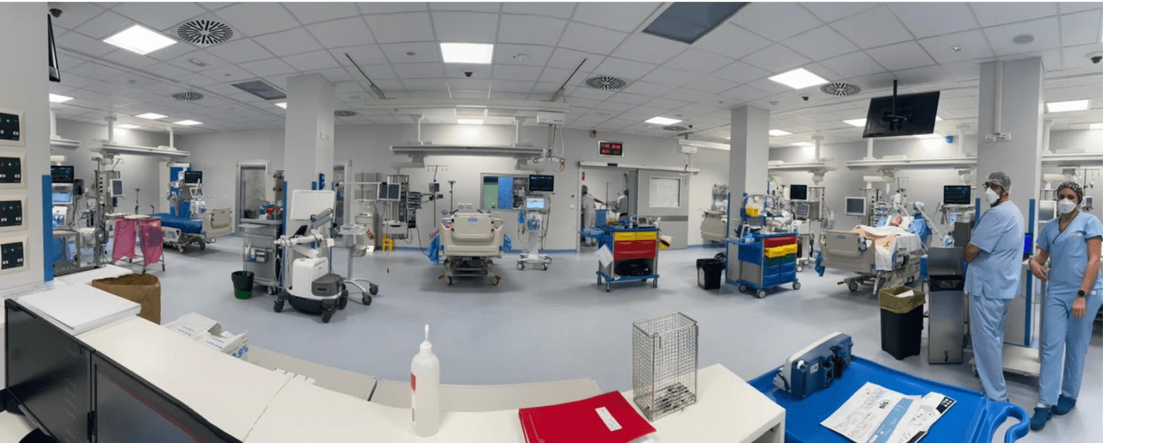 – L’ampia sala rianimazione ospita sette posti letto, tutti dotati di un nuovo sistema di monitoraggio multiparametrico. Ogni posto letto è provvisto di travi e pensili, di sistemi di sollevamento e movimentazione a binario della persona e della strumentazione necessaria alla rilevazione al monitoraggio dei parametri vitali ed emodinamici e la raccolta dei parametri di ventilazione del malato.