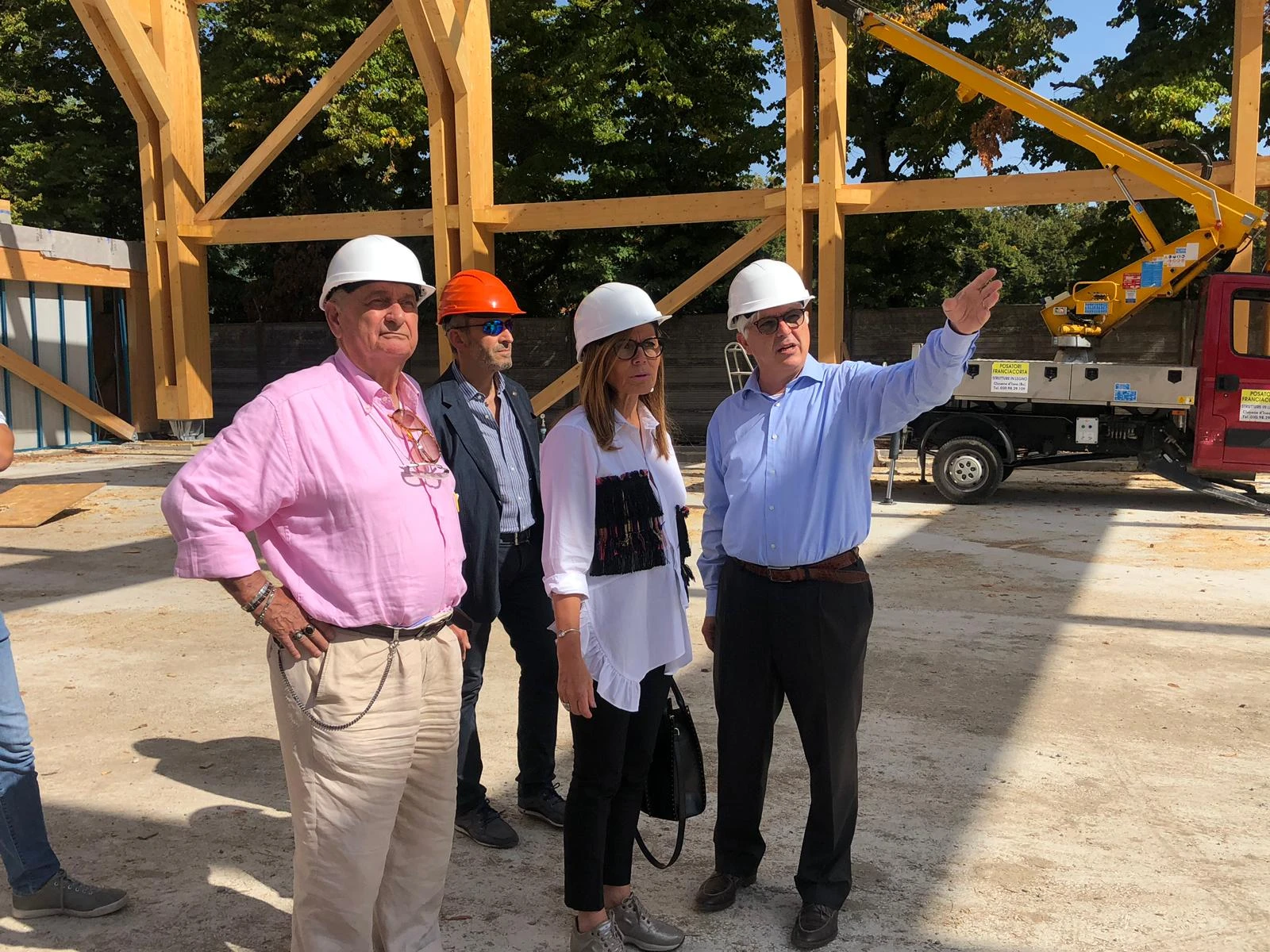 Il sopralluogo ai Pontieri ha permesso di verificare lo stato di avanzamento dei lavori e di apprezzare, in particolare, la qualità costruttiva delle strutture portanti e delle lunghe travi in legno lamellare, realizzate su misura, come previsto dal progetto che, lo si ricorda, è stato approvato dalla Soprintendenza per i beni ambientali e architettonici, in considerazione della prossimità al complesso monumentale di Palazzo Farnese.
