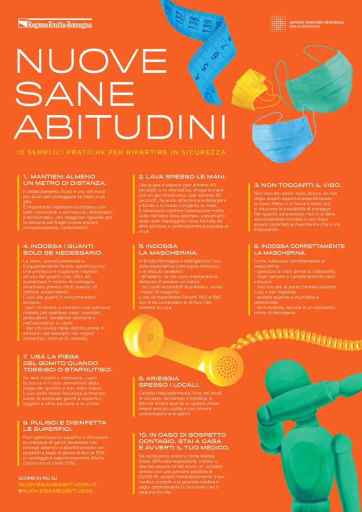 L’utilizzo delle mascherine, il rispetto del distanziamento, la consuetudine dell’igienizzazione. Sono alcune delle “Nuove sane abitudini” su cui punta la campagna di comunicazione della Regione Emilia-Romagna e del Sistema sanitario regionale. Una campagna che mira a garantire la salute dei cittadini nella fase post emergenza Covid-19, caratterizzata dalla ripresa delle attività sociali ed economiche.